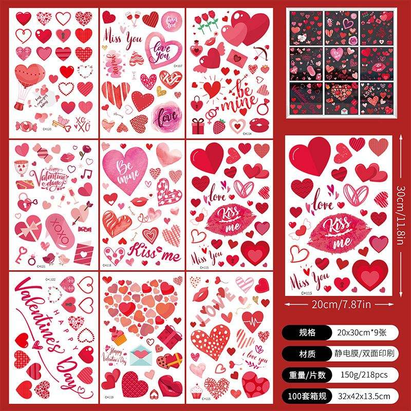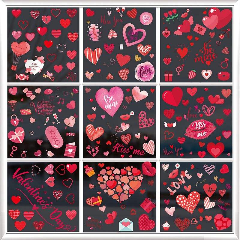 Adhesivos Decorativos para Ventanas de San Valentín, Doble Cara, 9 Hojas, Color Rosa y Rojo, con Forma de Corazón, Adhesivos para Ventanas de San Valentín