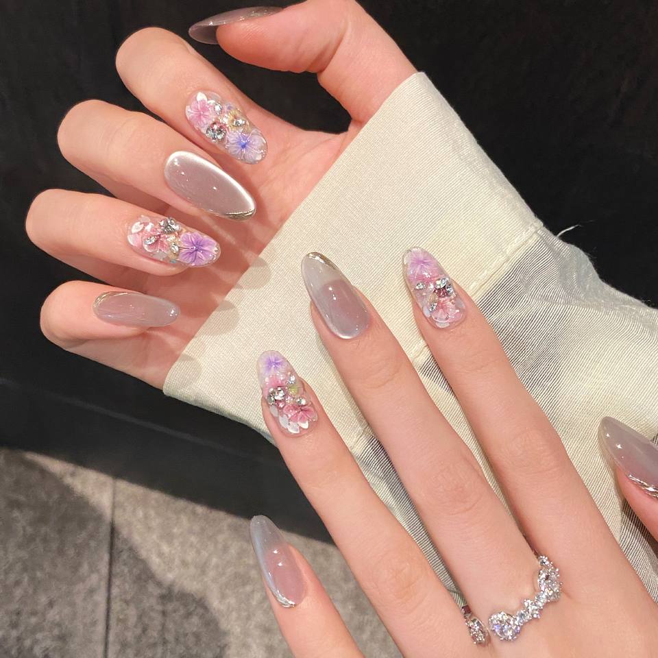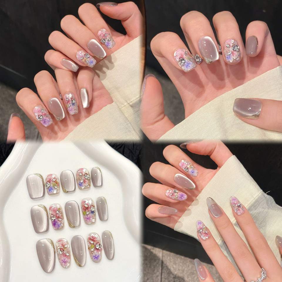 Flor seca Ojo de gato Hecho a mano Acrílico Diseñador Press-on Nails 10PCs Nail Art Uñas postizas para el dedo