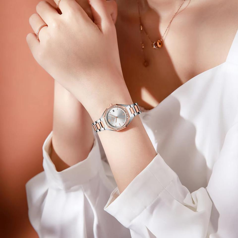 Drioshipping Lady Reloj de cuarzo Impermeable Luminoso Fecha Relojes de pulsera Banda de acero inoxidable Diseño poligonal Aleación de moda