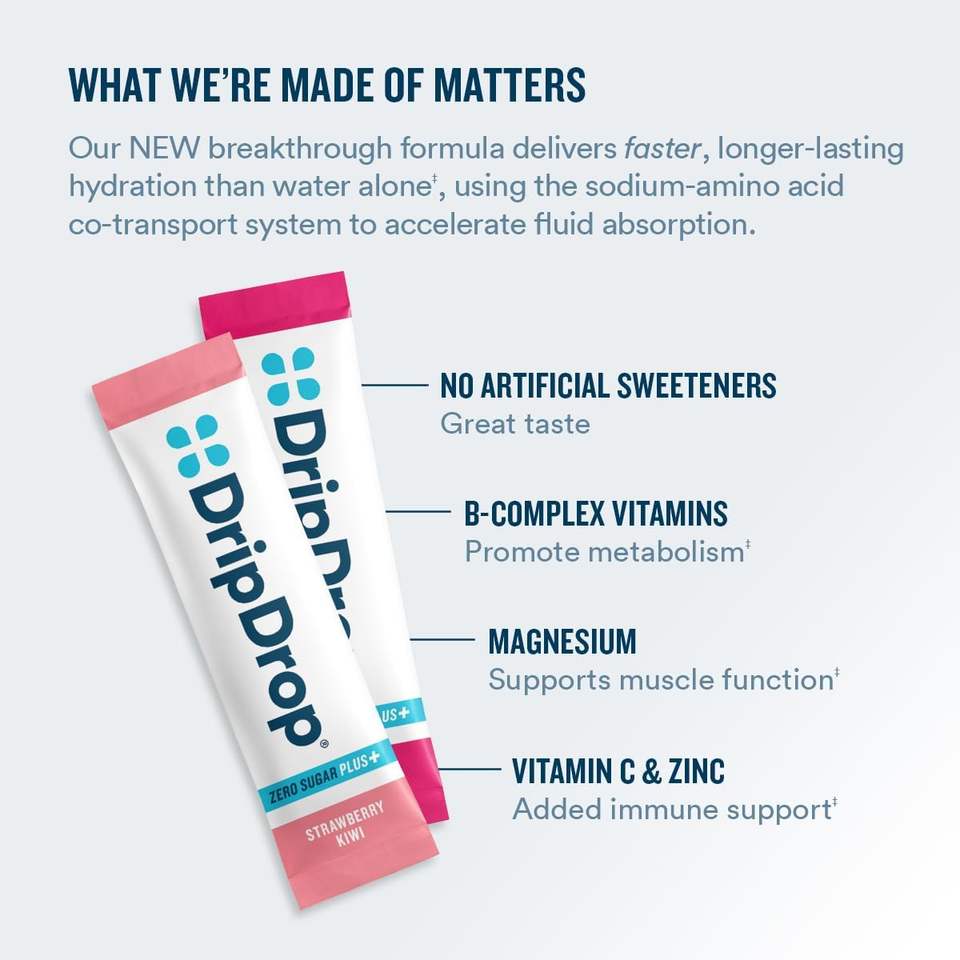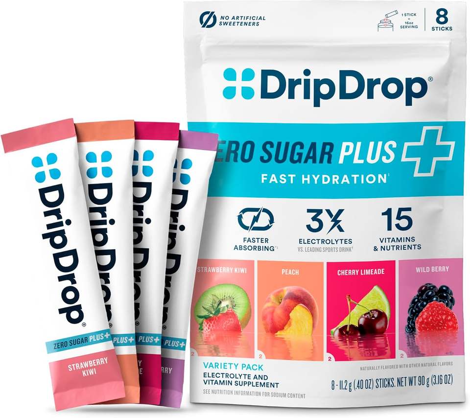 DripDrop Zero Sugar Plus - Mezcla de Bebida en Polvo con Electrolitos - Fresa, Kiwi, Melocotón, Limonada de Cereza, Bayas Silvestres, 8 Sobres
