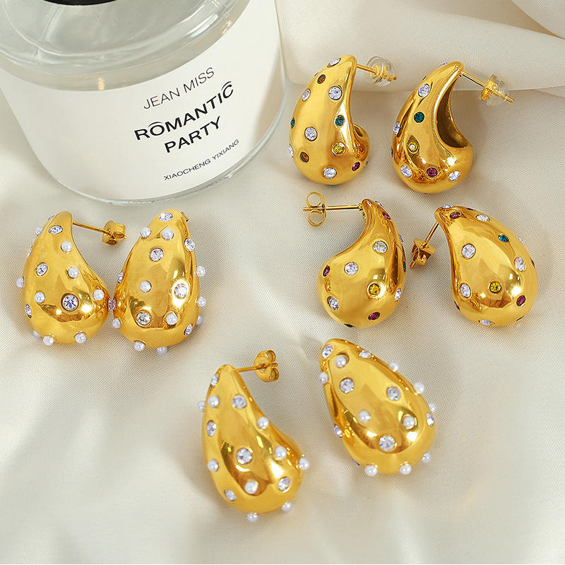 Pendientes colgantes con forma de lágrima, engaste de bisel de diamantes de imitación dorados, joyería de fiesta, poste de acero inoxidable para la oreja