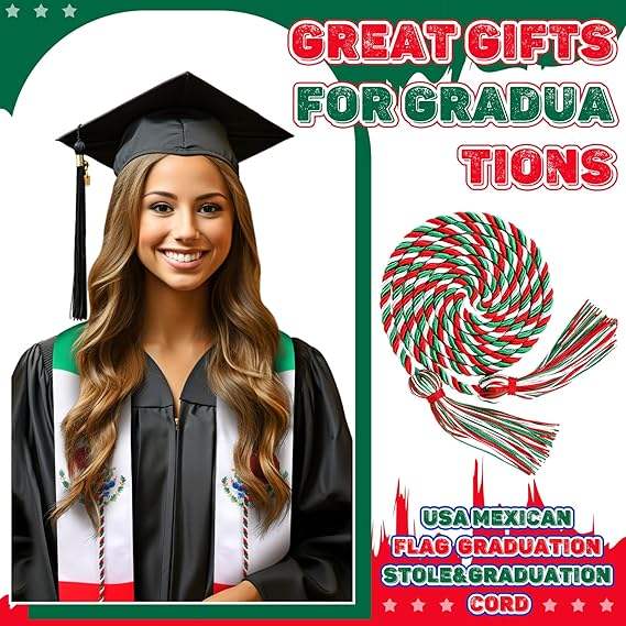 Estola de Graduación con Doble Bandera Mexicana y Cordones de Honor para la Celebración del Día de Graduación