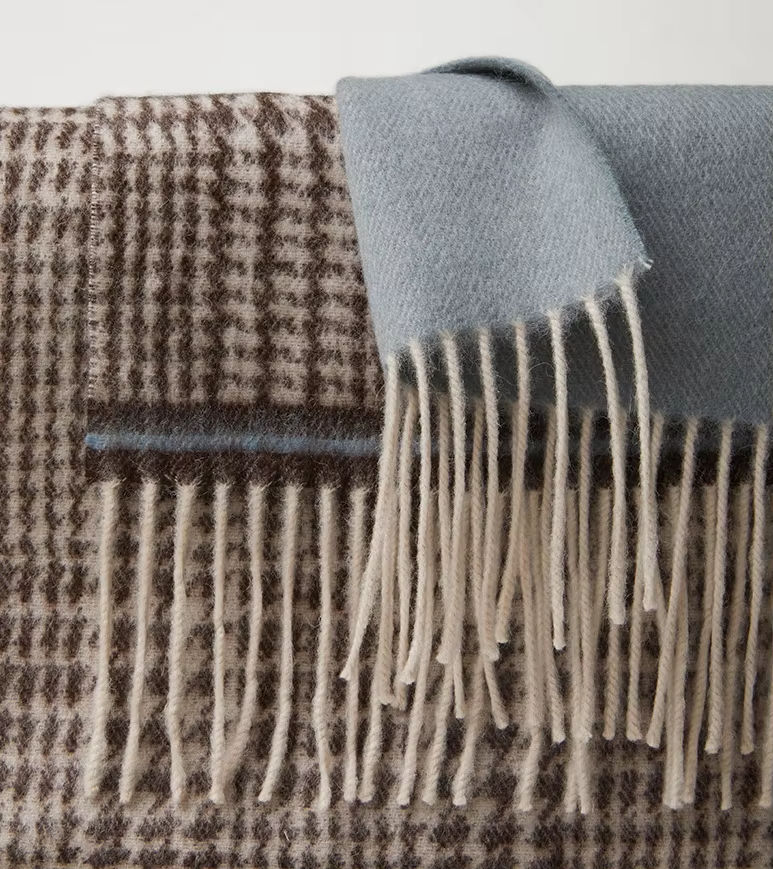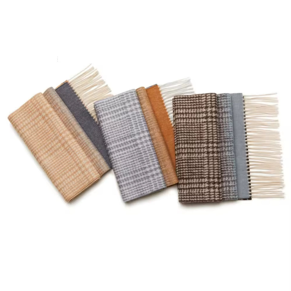 Bufanda Reversible de Doble Diseño, un Lado con Patrón de Pata de Gallo y el Otro Lado con Color Sólido, con Borlas a Juego