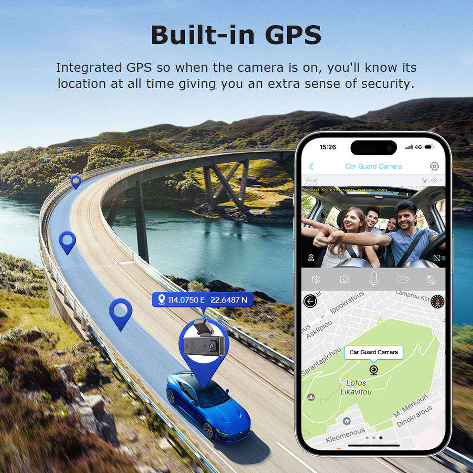 Cámara de Seguridad para Auto con Doble Lente de 6MP, GPS, Radar Delantero y Trasero, Sensor G, Almacenamiento en la Nube, Bajo Consumo, Vigilancia de Estacionamiento