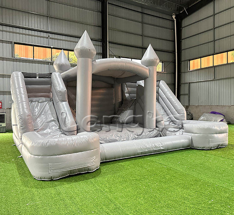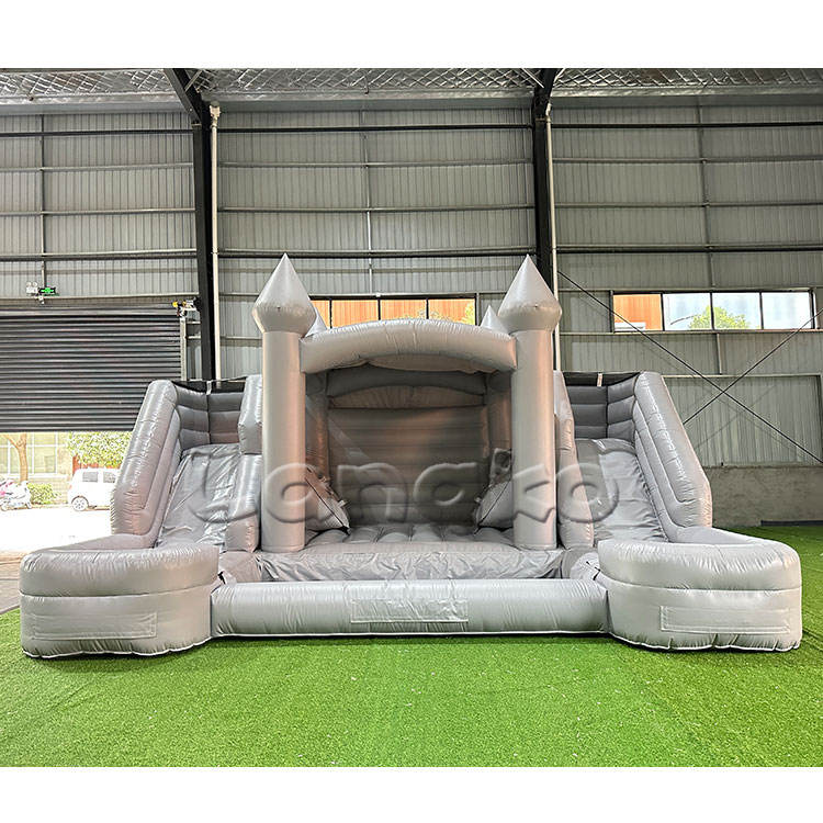 Casa de rebote combinada inflable de doble carril, Castillo de salto gris de lujo, inflable con tobogán