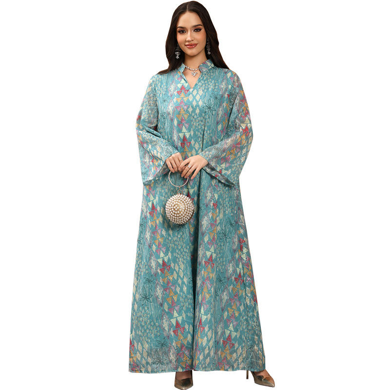 Vestido largo de algodón con estampado geométrico azul para mujer con cintura ceñida