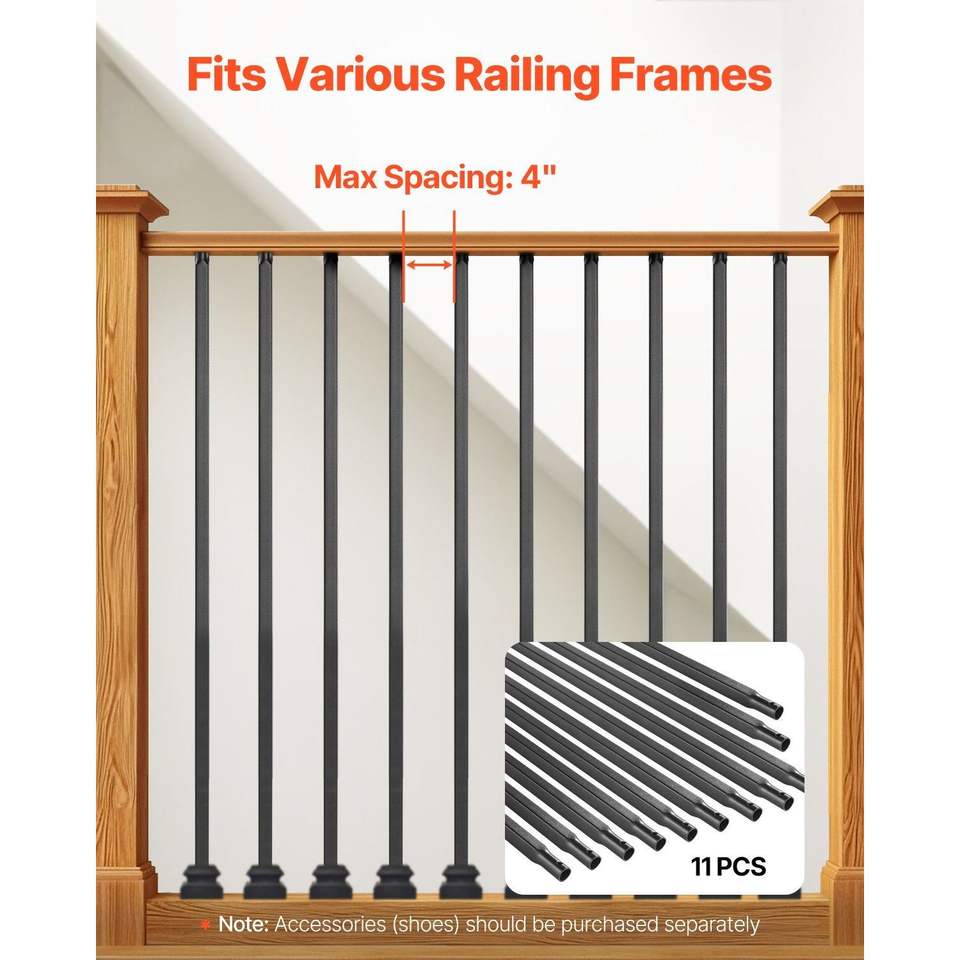 Juego de 11 Balaustres Cuadrados de Acero al Carbono de 44 Pulgadas para Interiores, Balaustres de Escalera de 0.5 Pulgadas, Resistentes a la Corrosión, Piezas para Escaleras