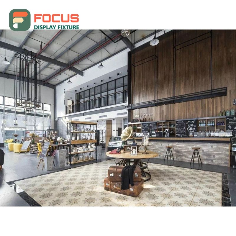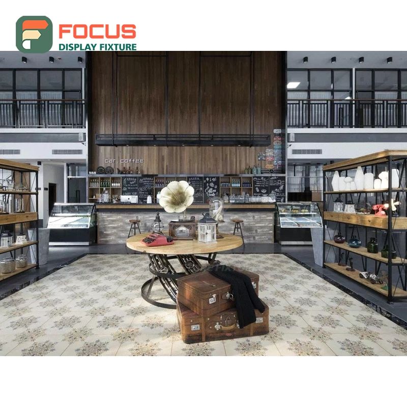 Exhibidor de Productos de Café Resistente, Acabado con Aspecto de Madera, Diseño de Estantes Abiertos, Exhibidor para Cafetería
