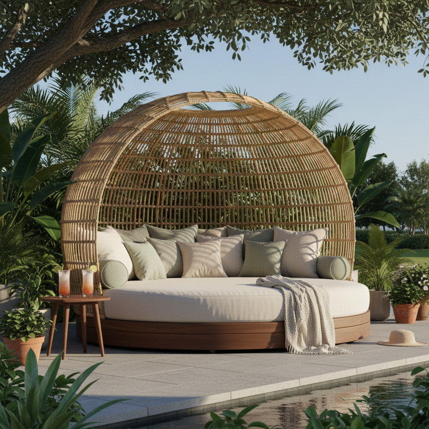 Tumbona de Ratán Duradera, Ecológica, Portátil, Contemporánea, Resistente a los Rayos UV, con Cojín de Esponja para Uso en Hoteles, Villas y Exteriores