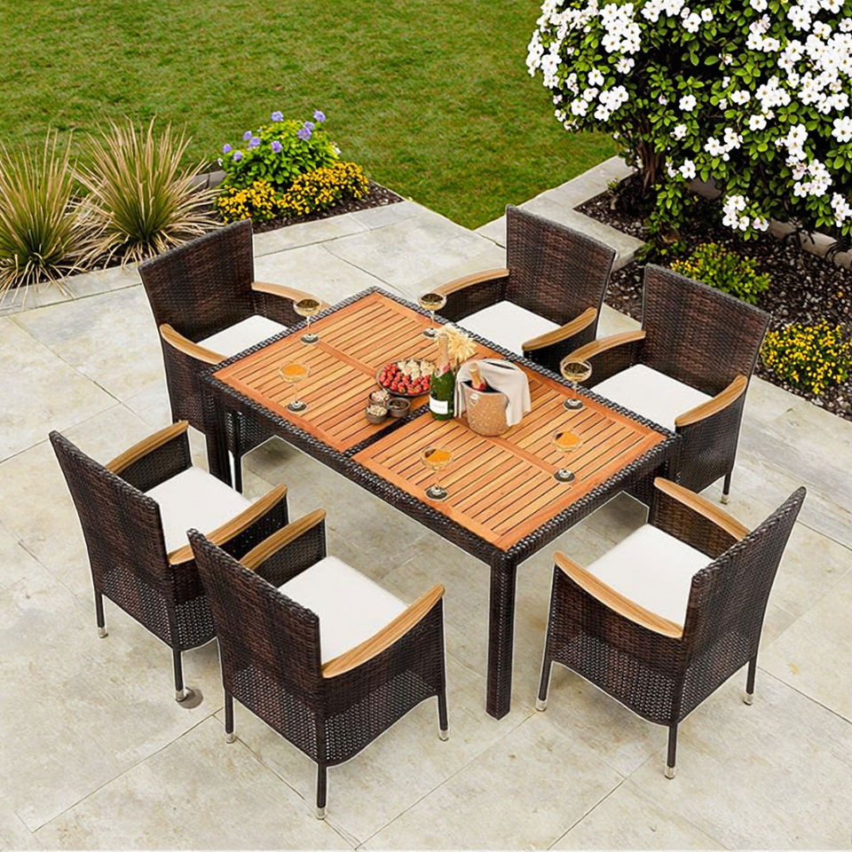 Conjunto de Comedor Moderno y Duradero para Exteriores con Sillas de Ratán Sintético, Cojines Suaves, Material de Mimbre Sintético, 6 Plazas, Negro