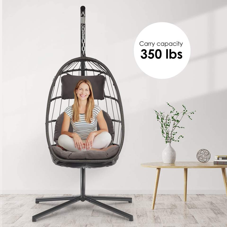 Silla Colgante Tipo Huevo para Interiores y Exteriores con Soporte, Estructura de Acero y Aluminio Resistente a la Intemperie, Mimbre de Ratán, Cojín Resistente a los Rayos UV