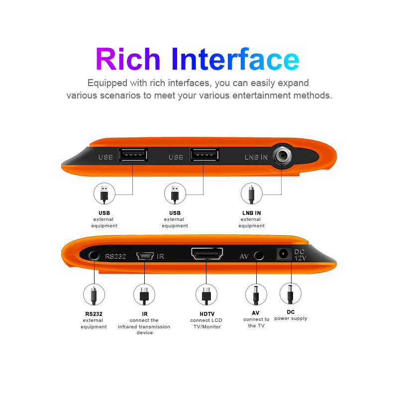 Interface:2*USB Port, 1 RCA/AV Output, 1*HD OUT, IR Cable with 4x7 Display