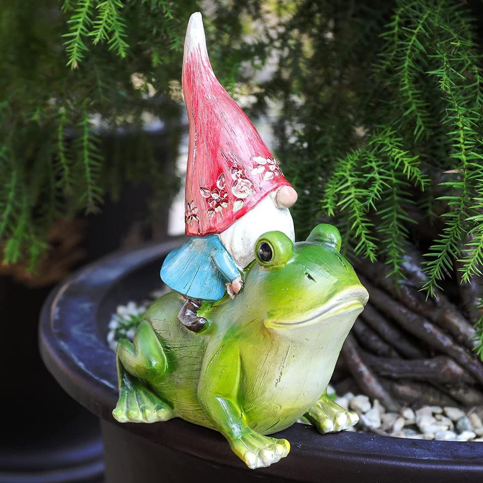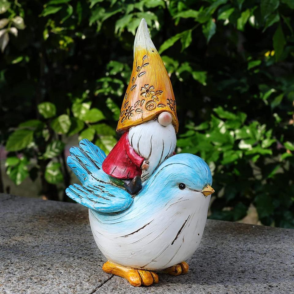 Enano montando pájaro pequeño jardín resina artesanía ornamento Animal estampado estudio decoración regalo de Pascua con cubierta de cara de duende