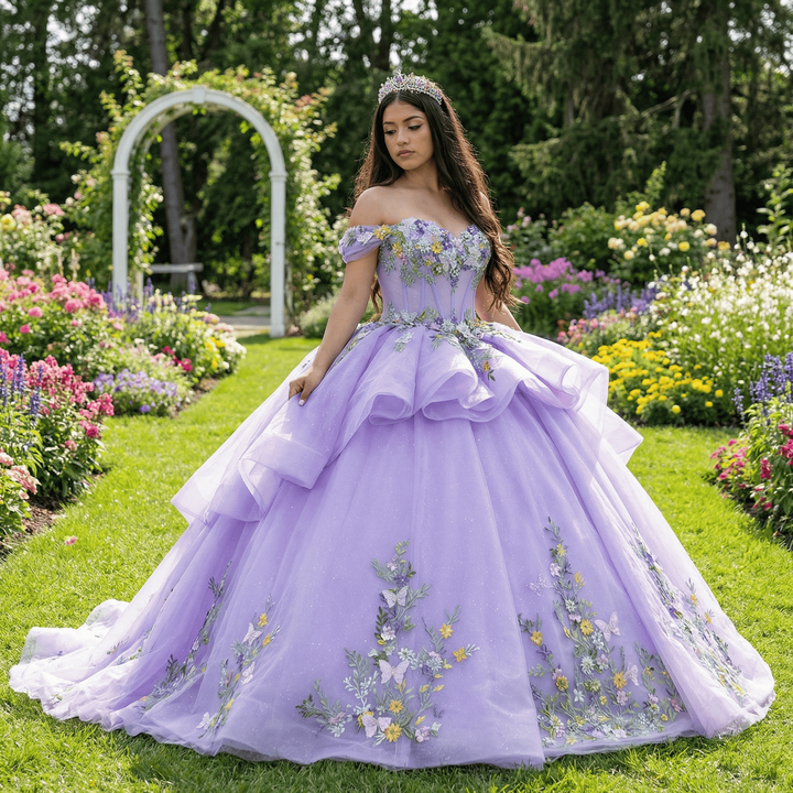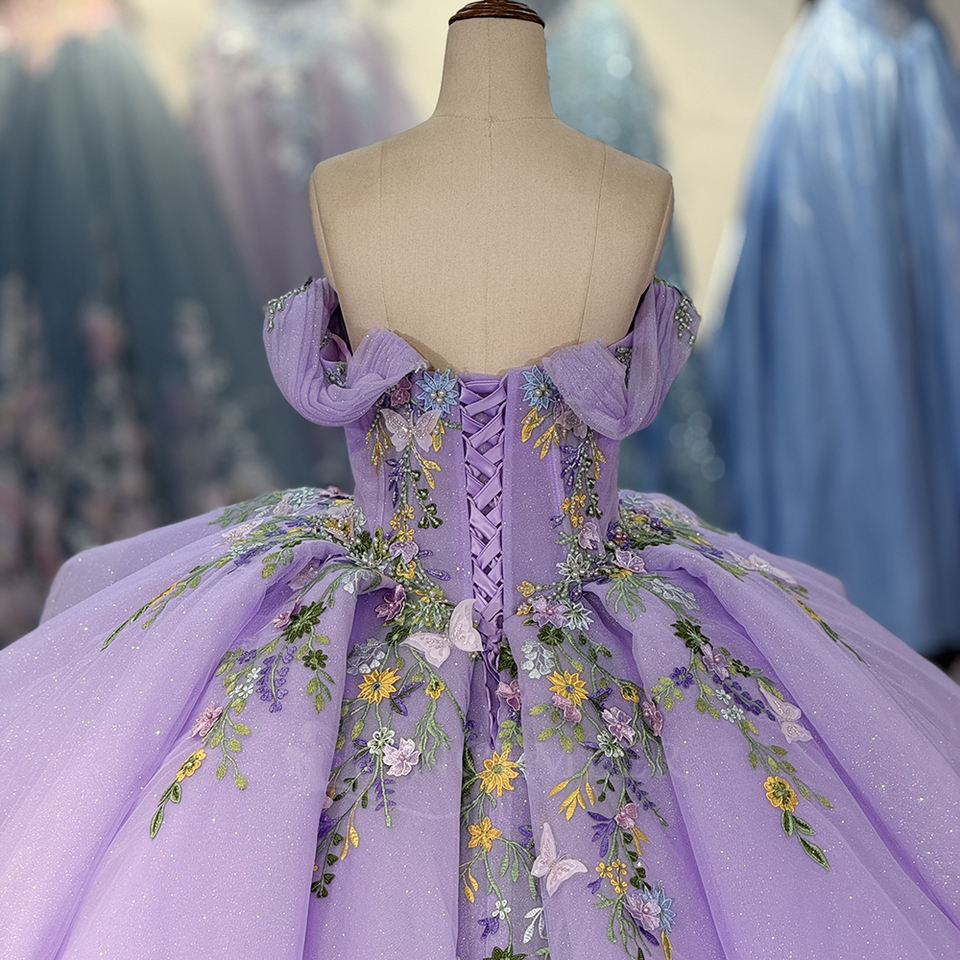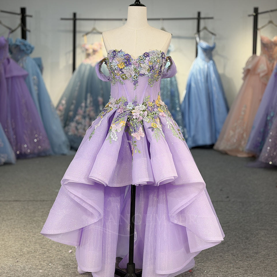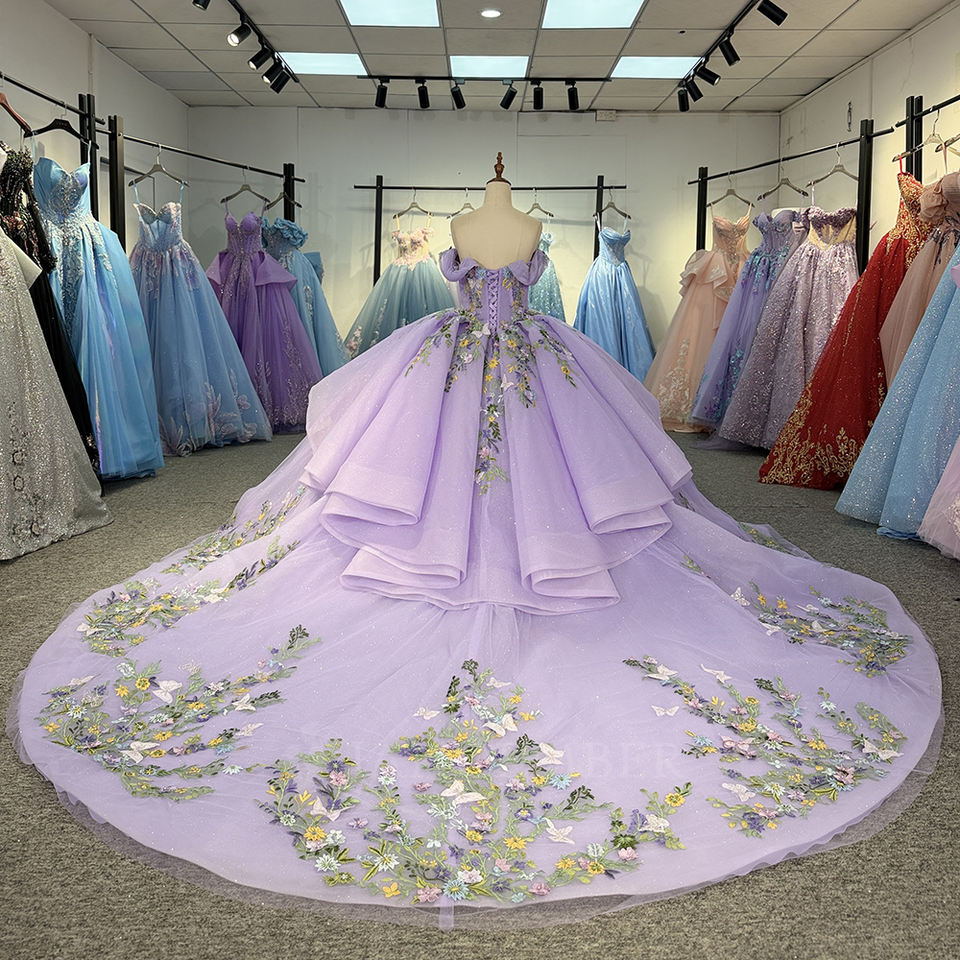 Dy6528 2 1 Vestidos de Quinceañera de Encaje Morado Claro, Vestido de Fiesta con Flores 3D, Escote Corazón, Cola Watteau, 100% Algodón