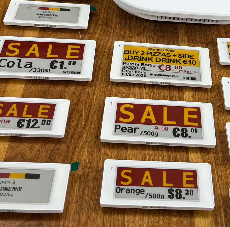 Etiqueta Electrónica de Precio ESL con Pantalla de Tinta Electrónica (E Ink/E-Paper) de 1.54, 2.13, 2.66, 2.9, 3.5, 4.8 y 7.5 Pulgadas, 4 Colores, Inteligente, con RFID, para Supermercados y Centros Comerciales