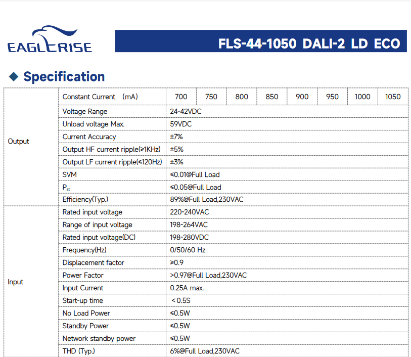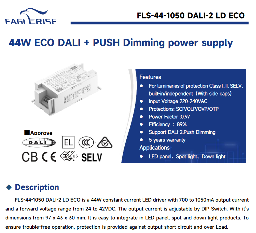 Fuente de Alimentación LED EAGLERISE FLS-44-1050 DALI-2 LD ECO DALI con Atenuación, Carcasa de Aluminio AC-DC, 24-42VDC, 44W, Garantía de 5 Años