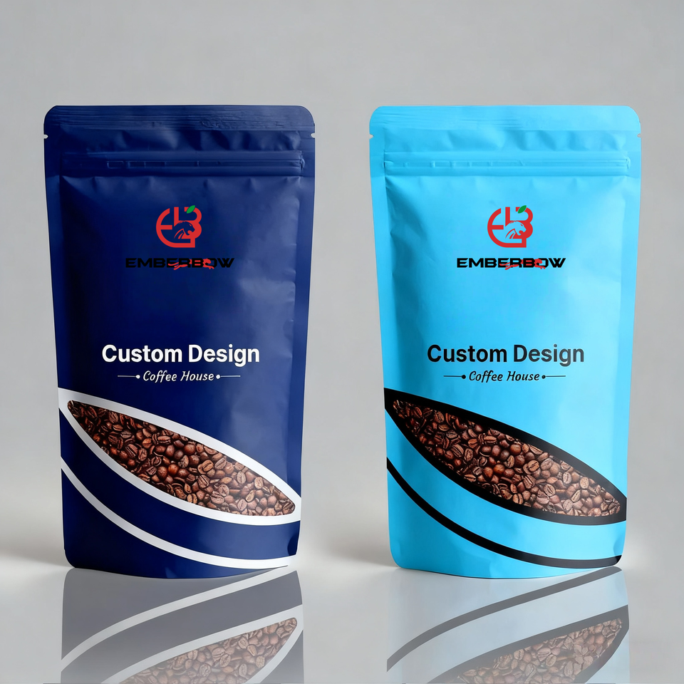 Embalaje EBB, bolsas de embalaje de café personalizadas, 12Oz, 250G, papel Kraft dorado, válvula de desgasificación a prueba de humedad, cremallera para cafetería