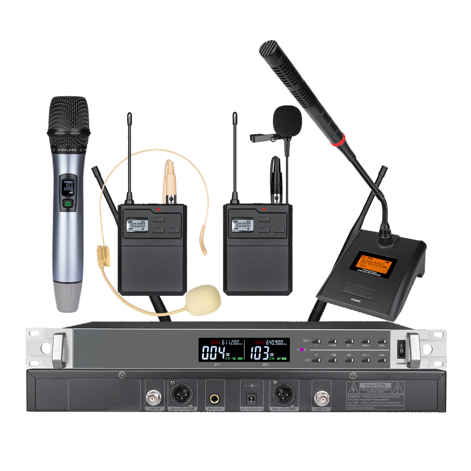 micrófono de mano, casco con micrófono, Micrófono de solapa, Micrófono de cuello de ganso, Wireless microphone