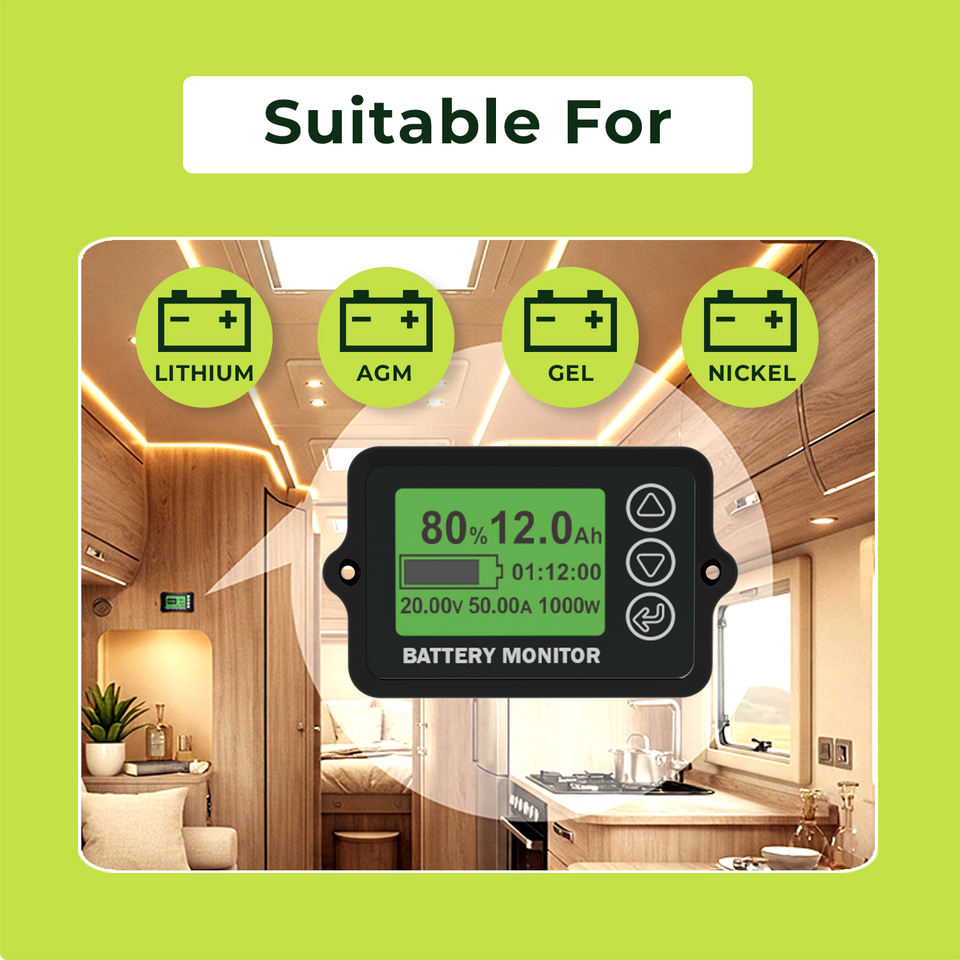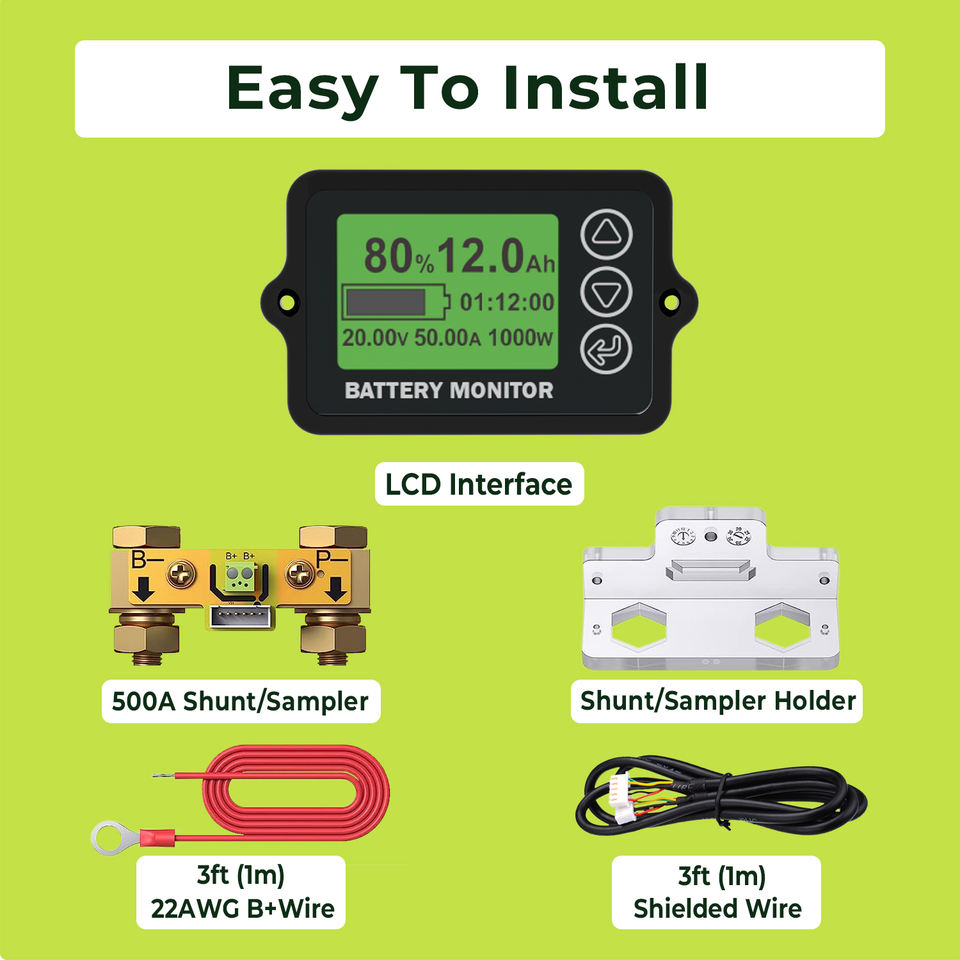 Monitor de Batería con Derivación de Corriente EJ-BC10 75A/150A/500A | Medidor de Capacidad y SOC LCD para Bancos de Baterías de Litio, AGM y GEL