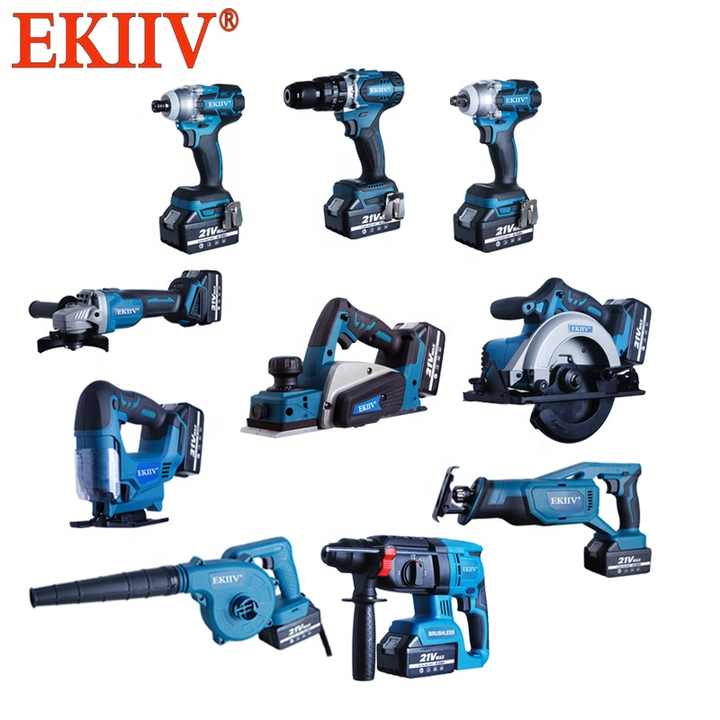 Martillo eléctrico, Destornillador eléctrico, Amoladora, Recortadora eléctrica, Taladro eléctrico, Llave eléctrica, Motosierra, Sierra de calar, Soplador, Altavoz, Luz LEDHerramienta incluye