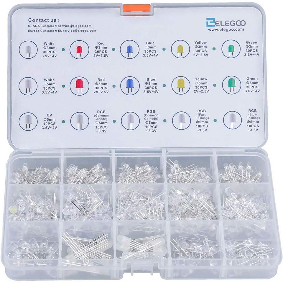 Kit de bombillas LED ELEGOO surtidas 3mm 5mm difuso claro 5 colores de luz con UV RGB CA compatible con parpadeo rápido