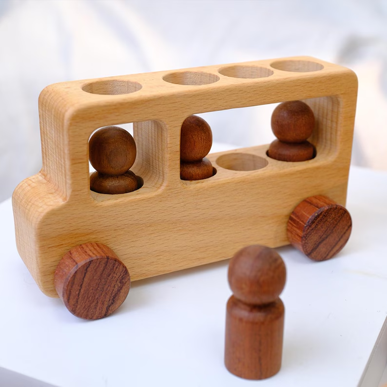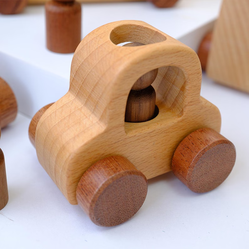 EN-71 BSCI FSC juego de coches de madera hechos a mano sólidos con Peg People Montessori juguete para niños pequeños