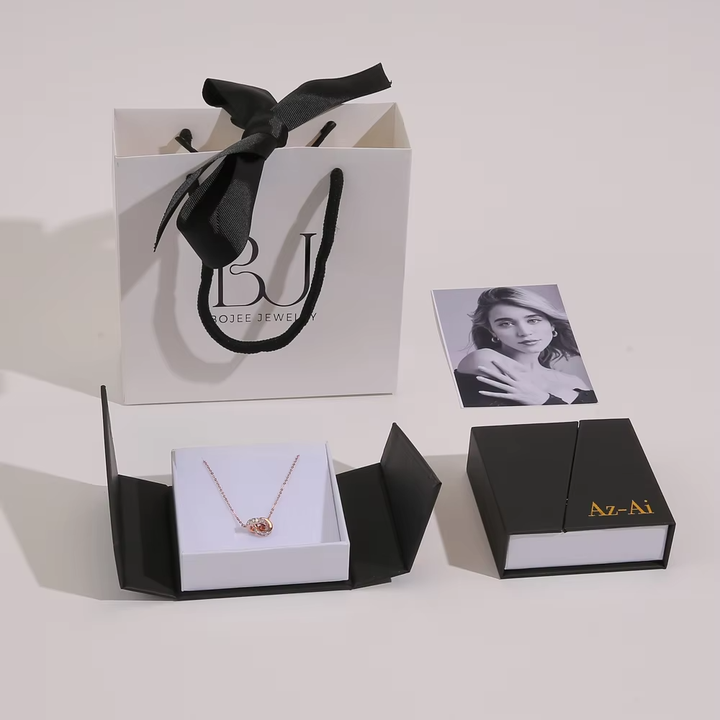Caja de cartón cuadrada de doble puerta con logotipo personalizado EQ para joyería, collar, colgante, cierre de hebilla de lujo para graduación
