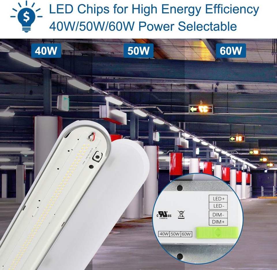 Lámpara Tri-proof LED para Garaje de 4 Pies, 40W, Conmutable, Resistente al Vapor, para Ubicaciones Húmedas