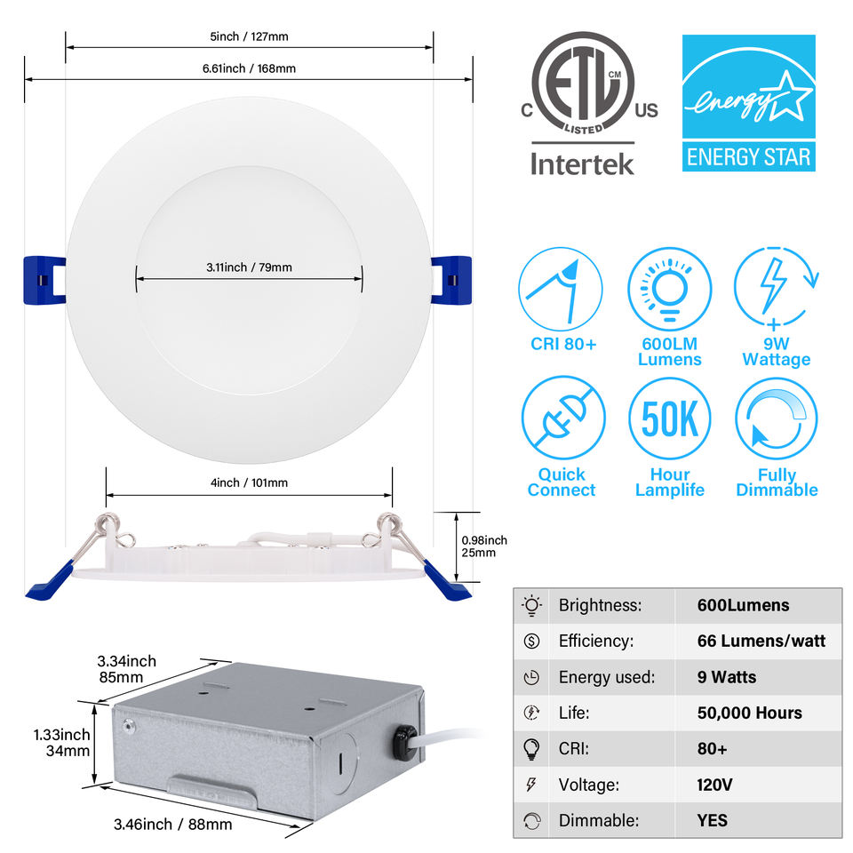 Lámpara de Techo LED Redonda Empotrada Ultrafina de 4 Pulgadas y 9w de Alta Calidad ETL