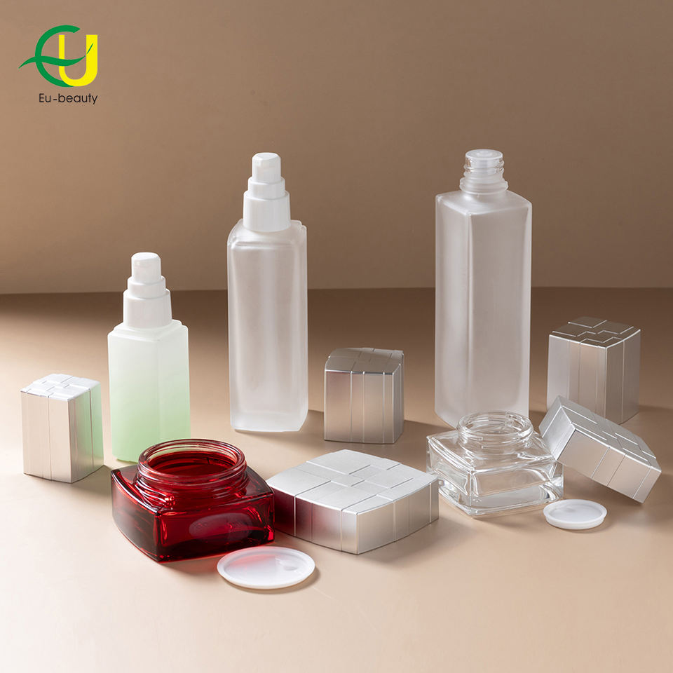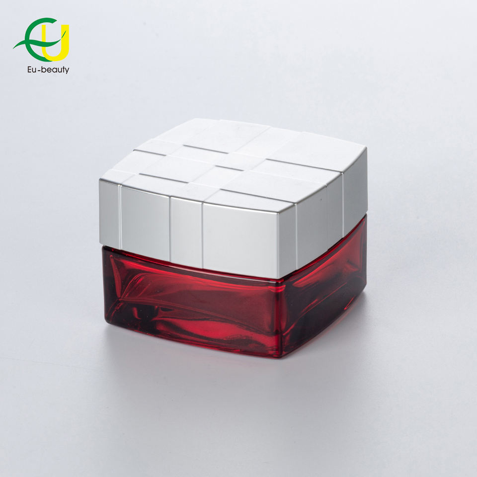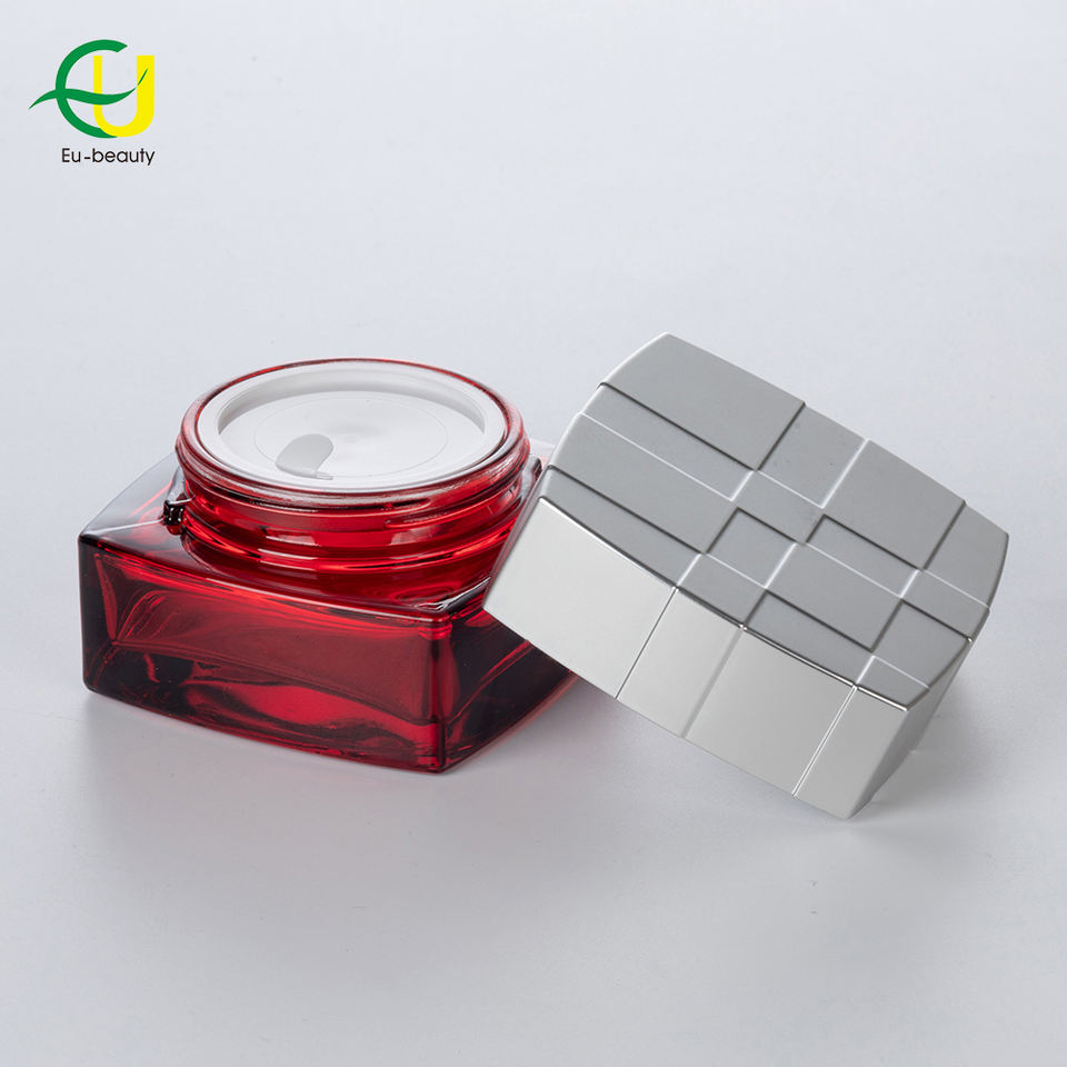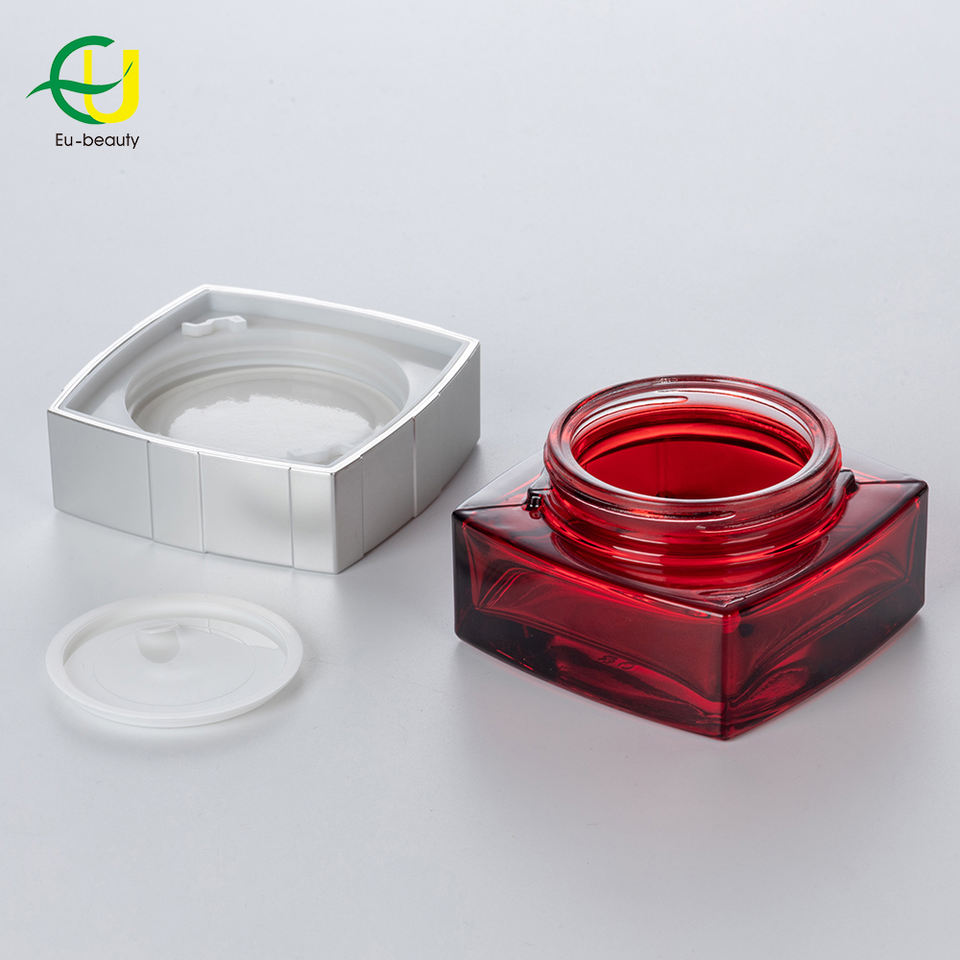 Muestras gratuitas de belleza de la UE, embalaje de vidrio, tarro rojo, crema, 30g, 50g, esencia para el cuidado del cabello, tarros de vidrio rojo reciclables con cubierta de tornillo de grano