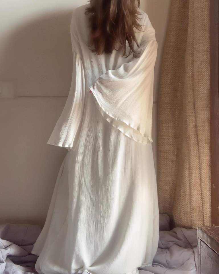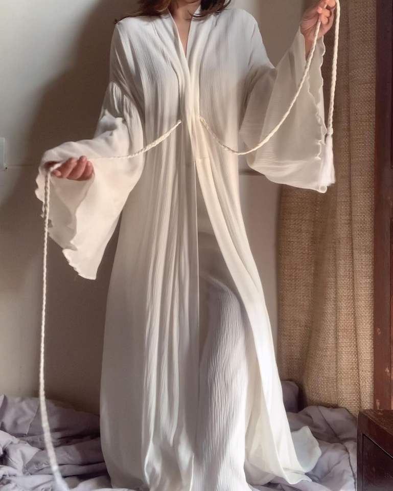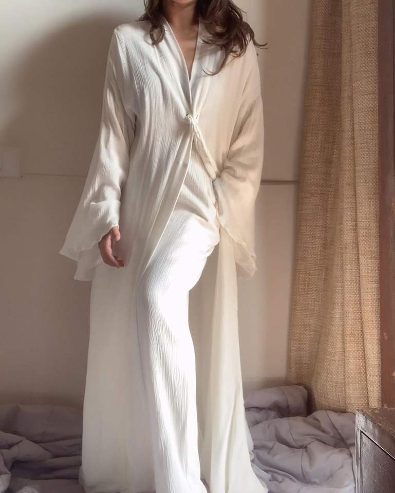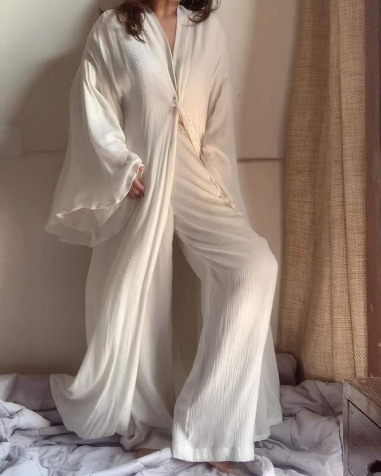 Ropa de salón elegante para principios de primavera y otoño para mujer, conjunto informal de manga larga de tela crepé de algodón holgado, tamaño libre para ocasiones en la playa