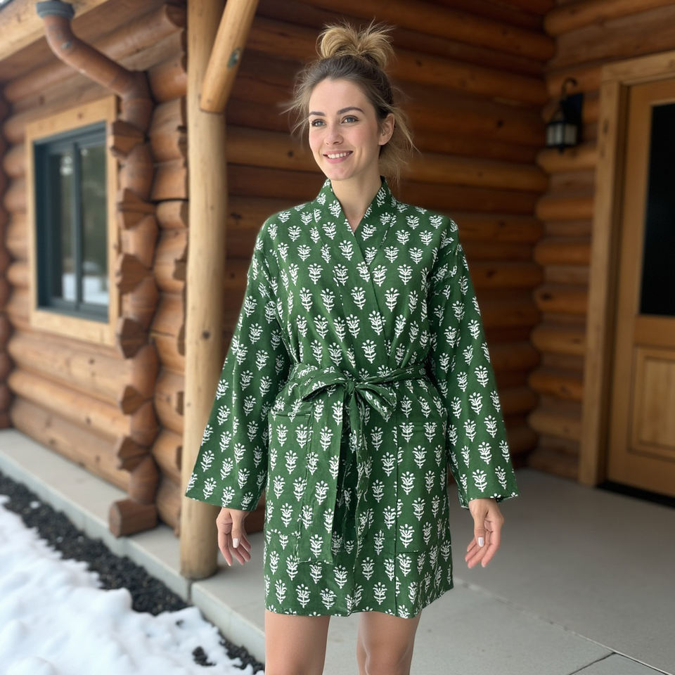 Earthly Elegance Modern Artisan Reverie Kimono Robe para mujer Cómodo de talla grande Refrescante Green Peace Block Print Woven