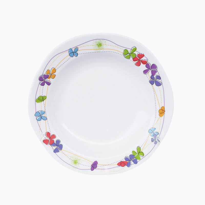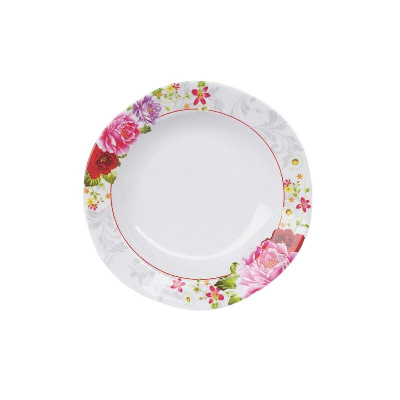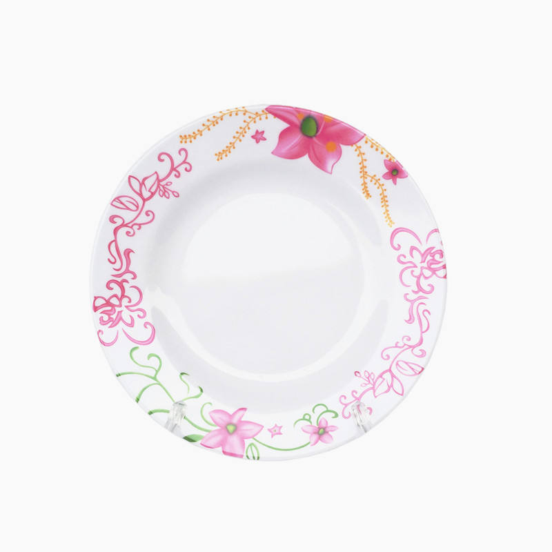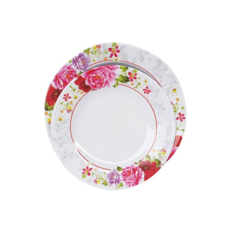 Nombre del Producto:Plato de cena de melamina con estampado floral, diseño ondulado lateral, fácil de limpiar, precio de fábrica.