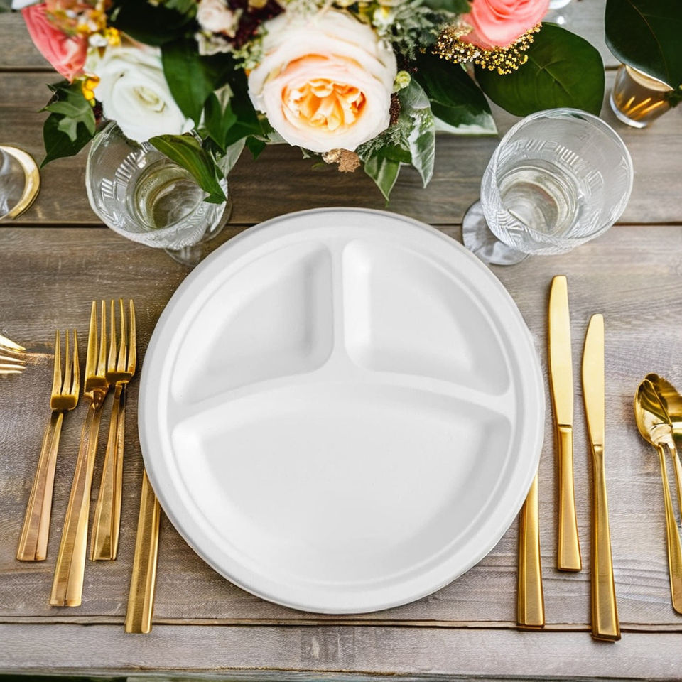 Plato Ecológico Biodegradable de Pulpa de Caña de Azúcar de 10 Pulgadas con 3 Compartimentos, Plato de Bagazo Compostable con Platos Libres de Químicos