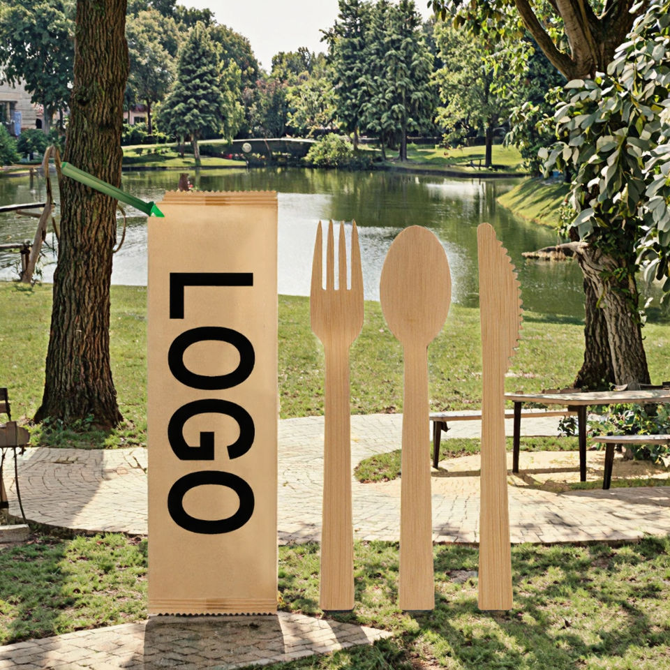 Juego de Cubiertos Desechables de Bambú Biodegradables y Ecológicos, 20-40 Piezas, con Logotipo Personalizado Impreso, Cucharas, Cuchillos, Tenedores, para Fiestas, con Bolsa