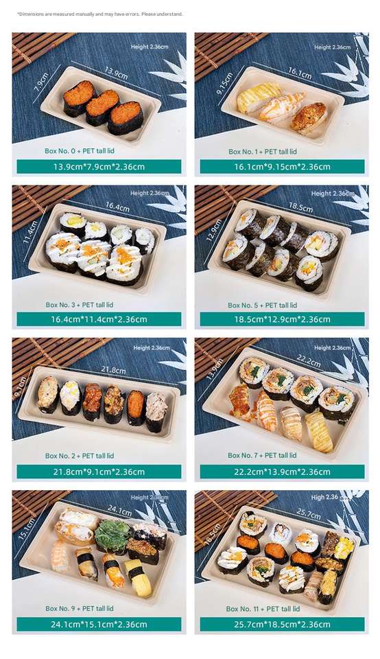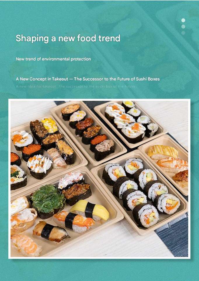 Cajas de sushi rectangulares desechables, ecológicas y biodegradables para llevar, ideales para sushi japonés.