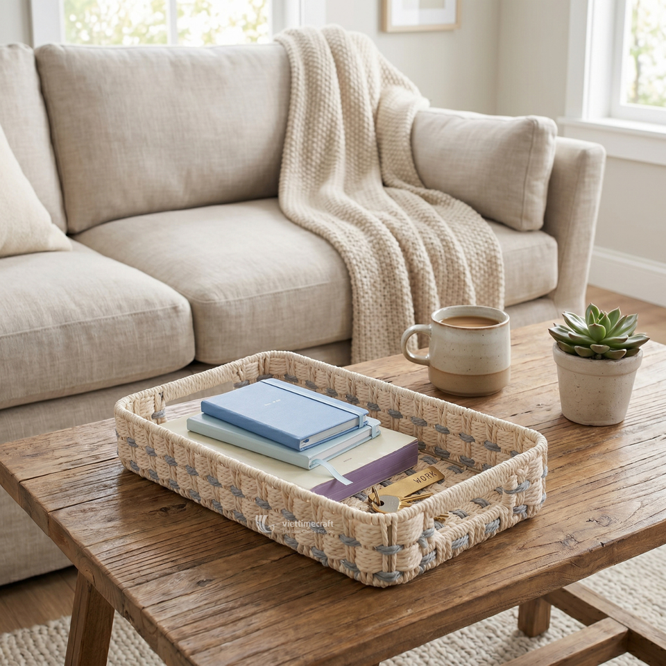 Bandeja de Almacenamiento de Cuerda de Papel Estilo Bohemio Ecológica - Organizador de Cocina de un Solo Nivel con Asas, Artesanía Sostenible Multifuncional