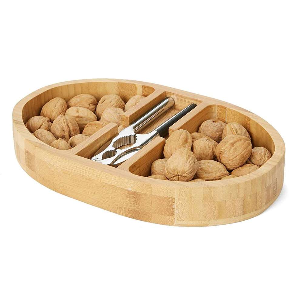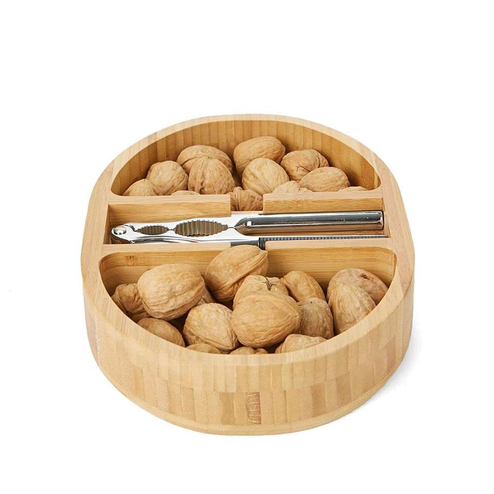Description:Bamboo wood Nut Cracker Bowl Serving Platter with Nut Cracker