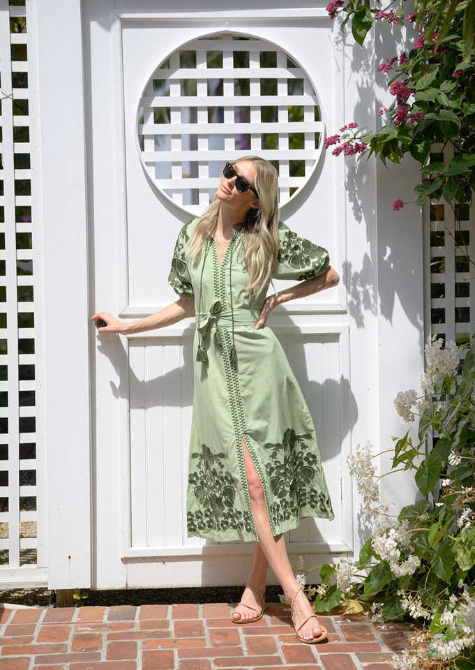 Maxi vestido verde sólido bordado ecológico con mangas cortas hasta la rodilla tejido de cintura Natural para ropa de fiesta