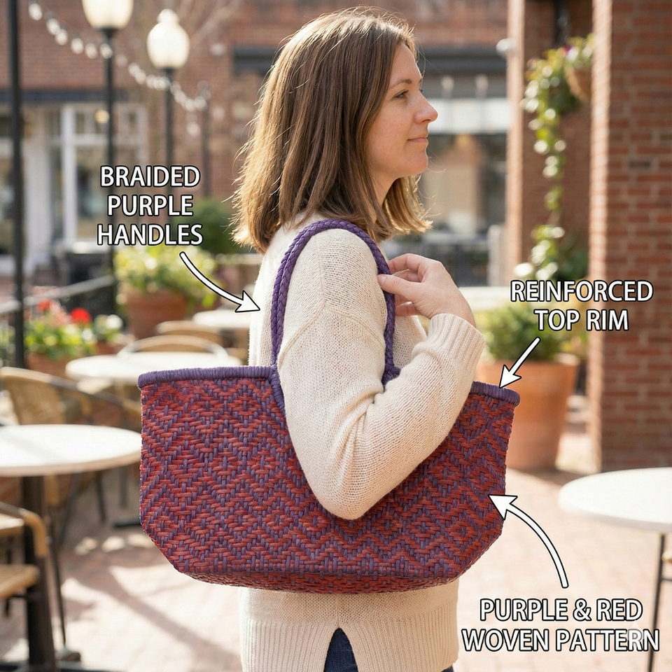 Bolso Tote Tejido a Mano Ecológico con Patrón Rojo Púrpura, Ligero, Impermeable, Asas Trenzadas, Cierre Abierto, Bolso de Hombro Hecho a Mano