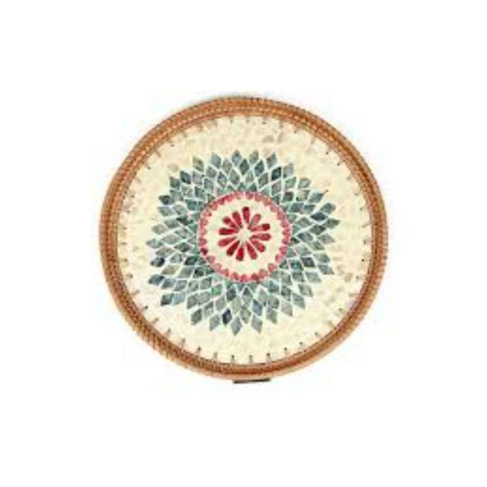 Bandeja de servir de ratán ecológica tejida a mano con base de nácar, cesta redonda decorativa de mimbre para almacenamiento y exhibición en la cocina