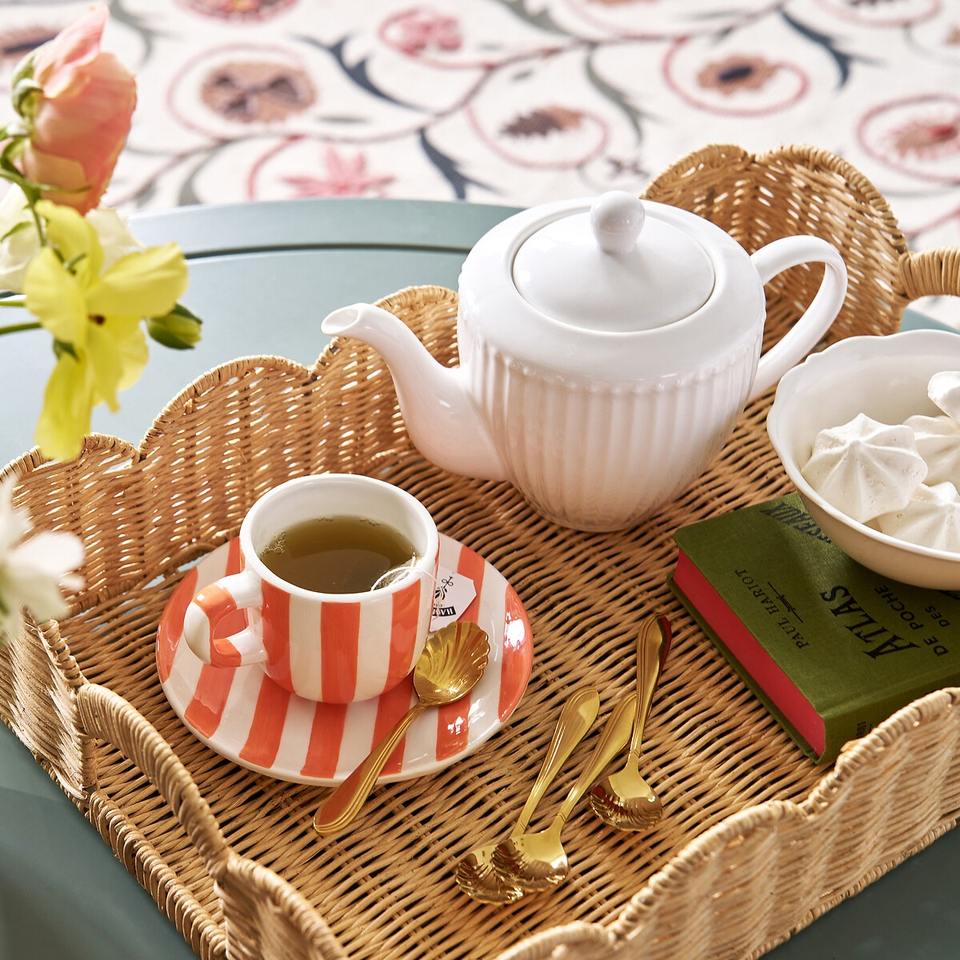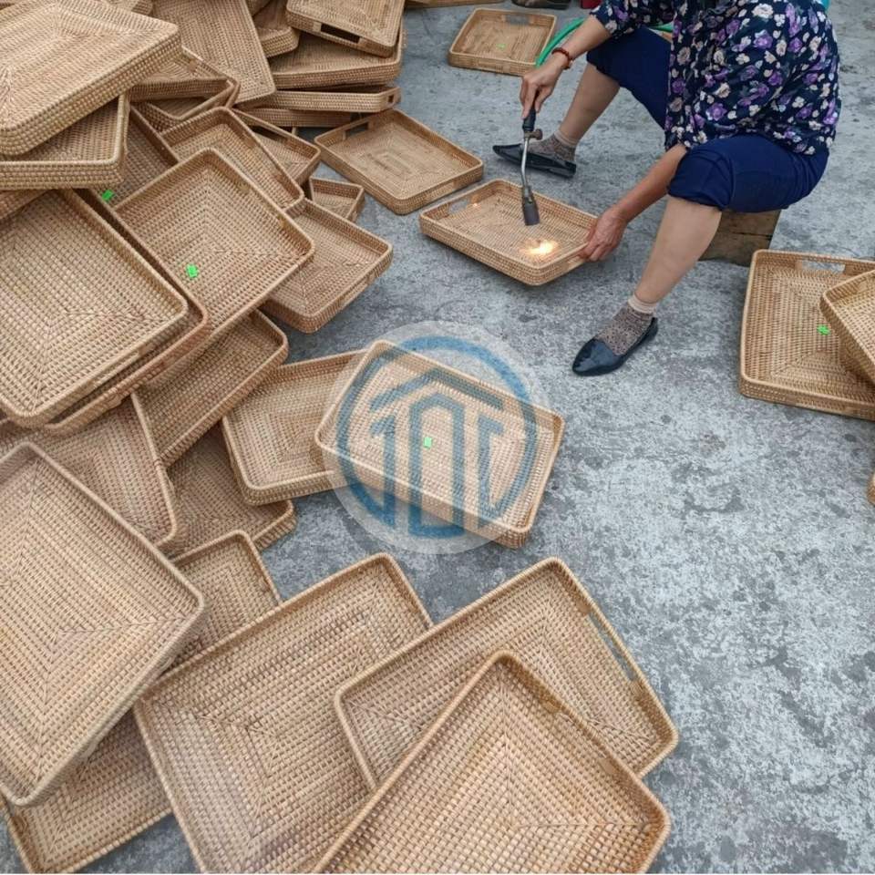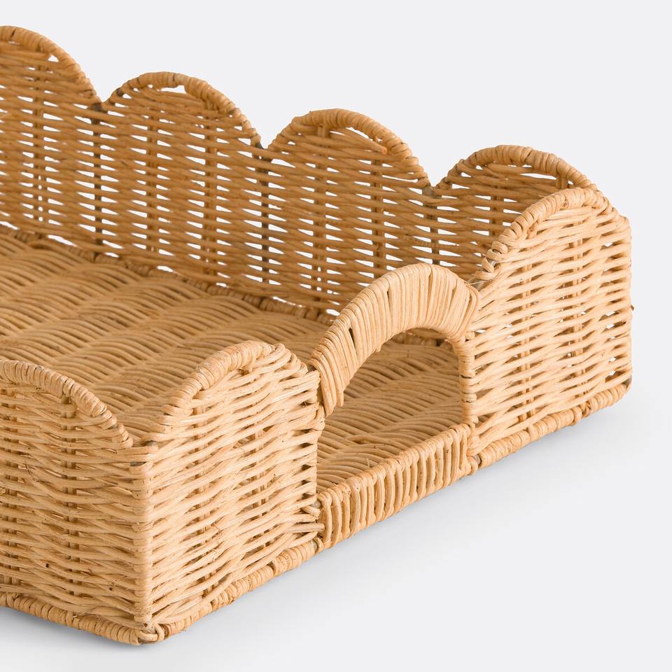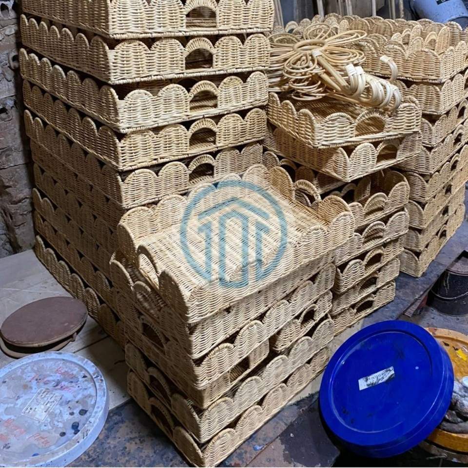 Bandeja de servir de ratán con borde festoneado, tejida a mano, ecológica, de forma rectangular, para cafetería, hotel, venta al por mayor, proveedor sostenible