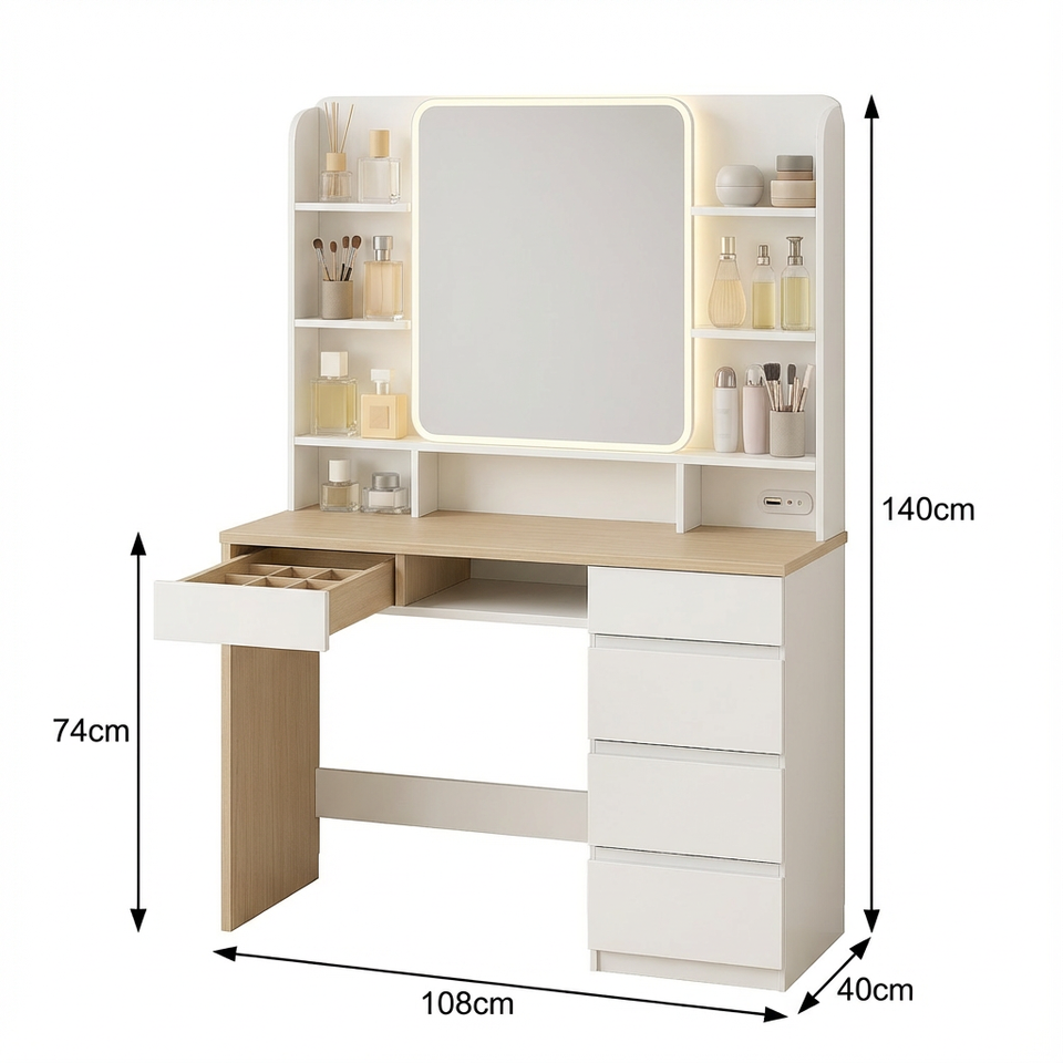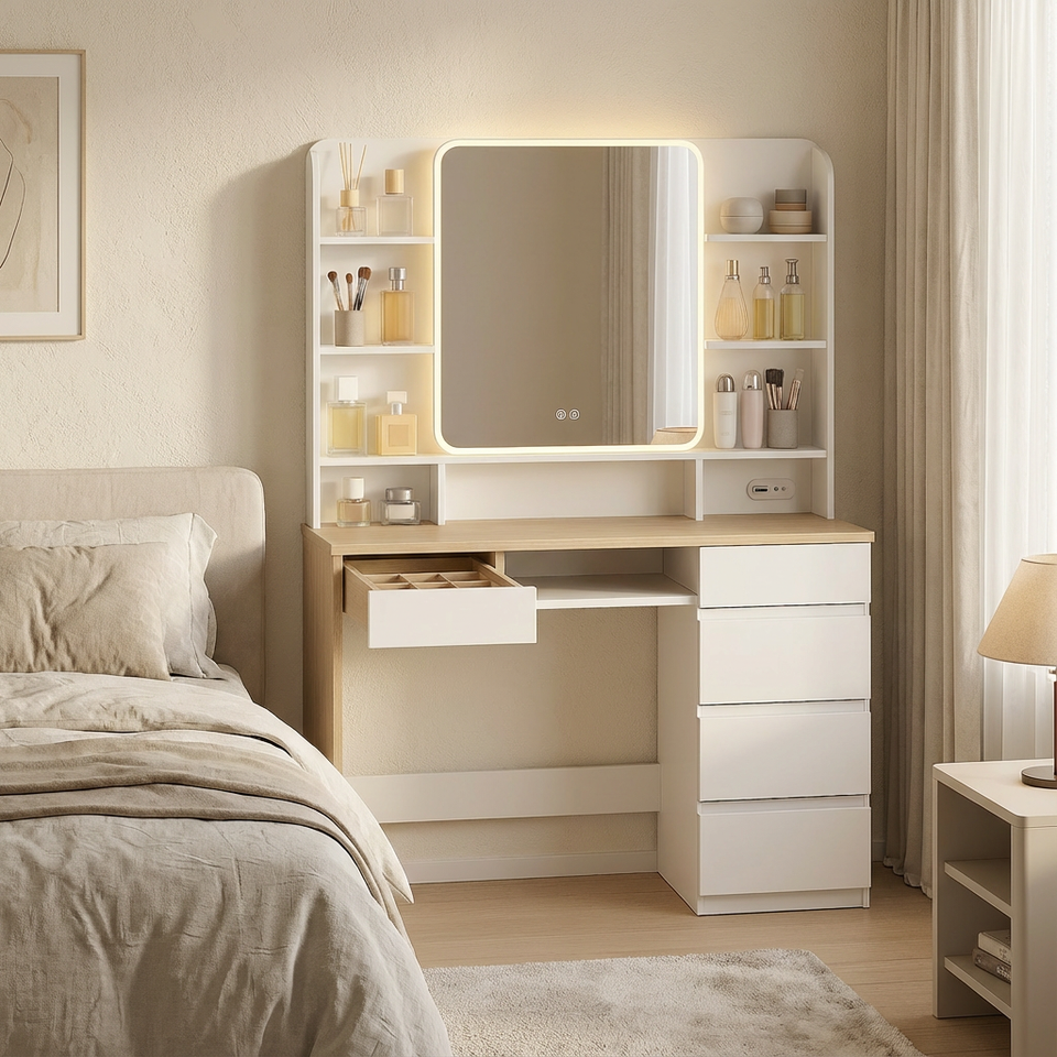 Escritorio de Maquillaje LED Ecológico con Carga Integrada y Almacenamiento Incorporado para Hogares Contemporáneos