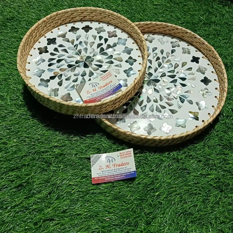 Elegante Diseño Redondo para Decoración del Tiempo del Té y Regalos Festivos, Juego de Bandejas de Servir de Ratán con Madreperla, Artesanía India Shahi Mehfil