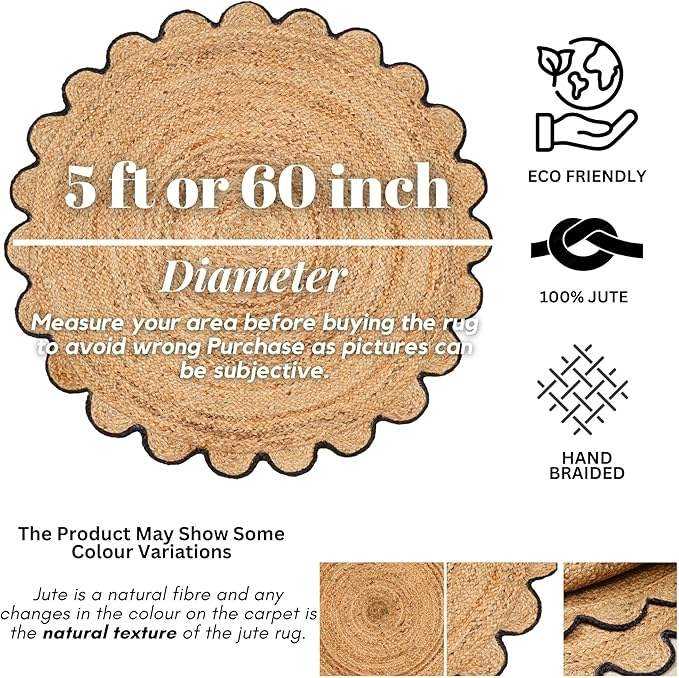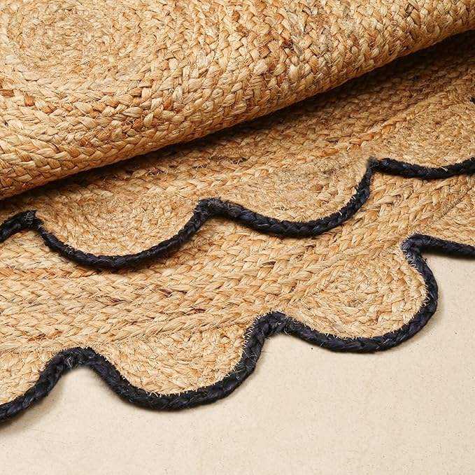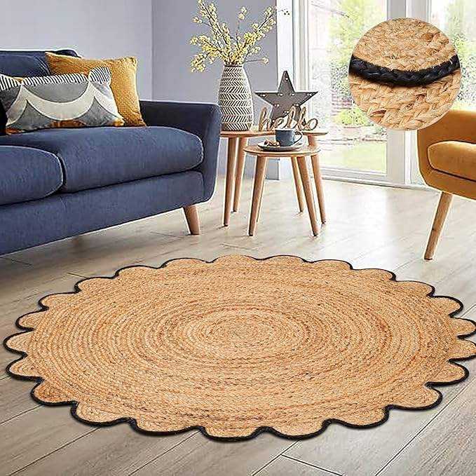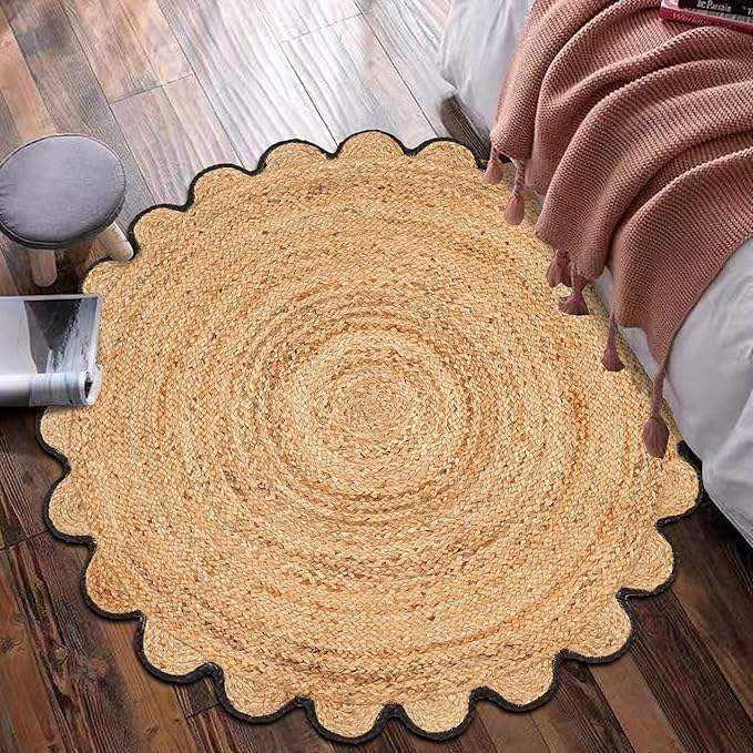Alfombra redonda de yute ecológica hecha de yute natural con fibras festoneadas para diseños de hogar modernos.