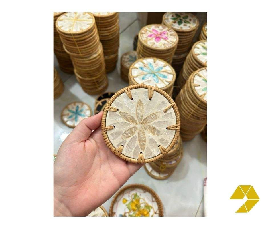 Decoración de mesa ecológica sostenible que incluye un plato de ratán placemate de concha estilo hecho a mano y posavasos de mosaico de nácar brillante