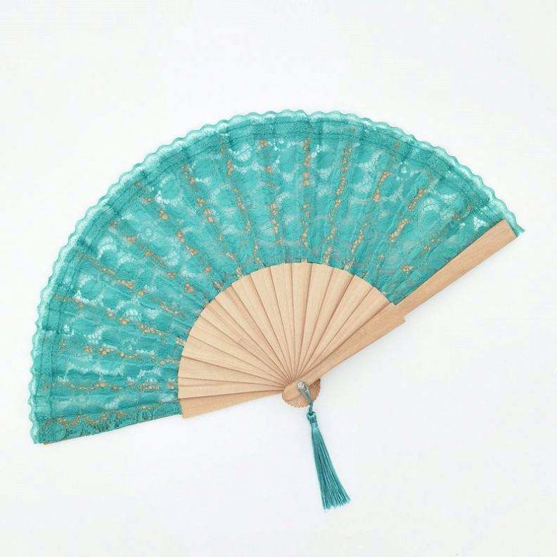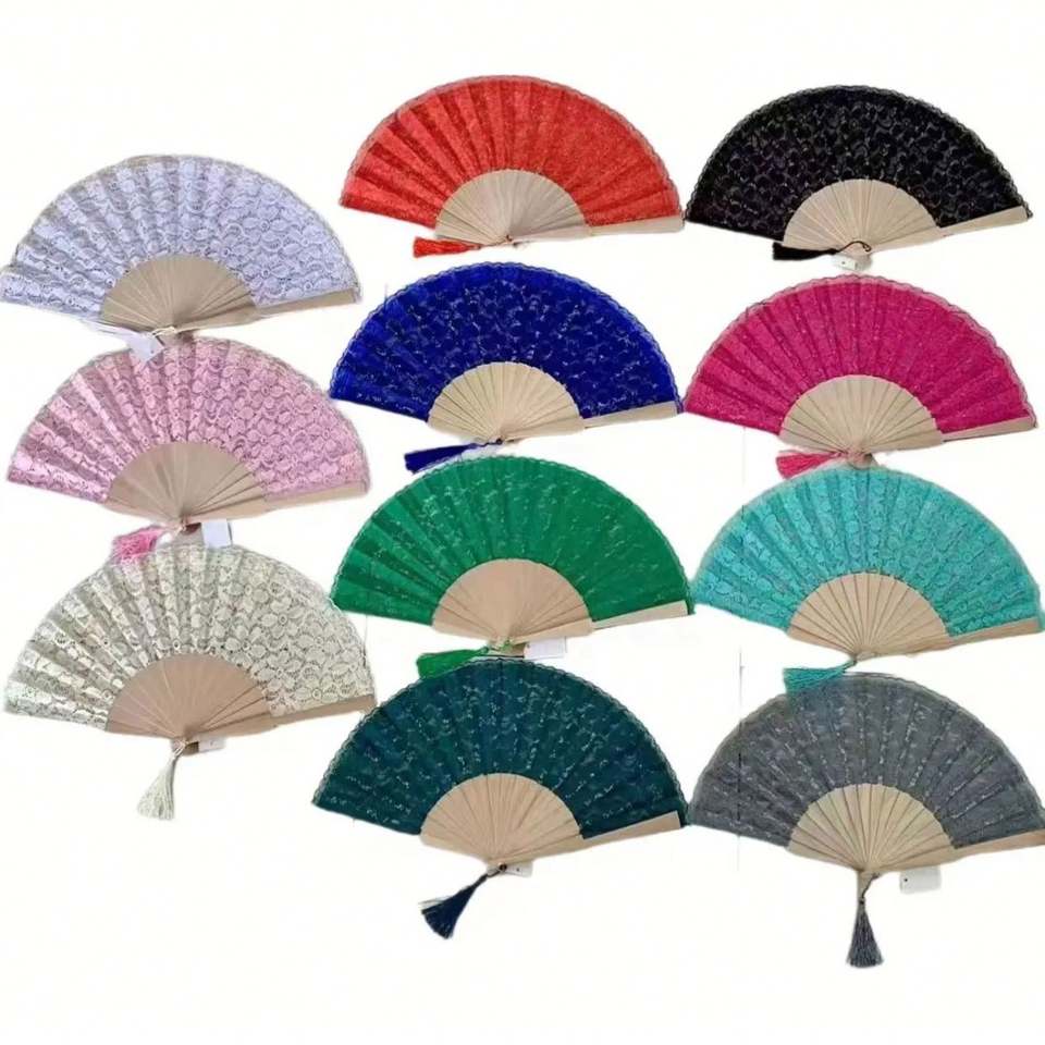 Abanico de mano ecológico de tela de encaje multicolor con varillas de madera, diseño pintado, hecho a mano, para bodas y fiestas