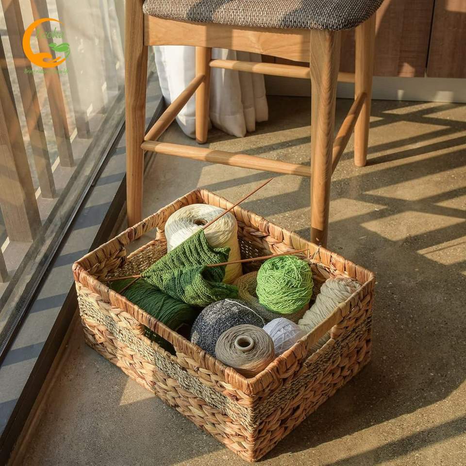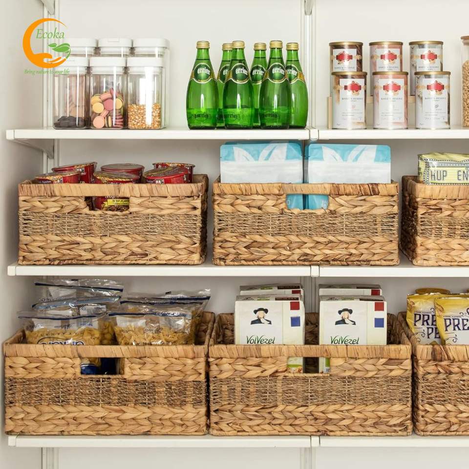 Cesta de Almacenamiento Multifuncional Ecoka, Hecha a Mano, Ecológica, de Jacinto de Agua y Pasto Marino Natural, con Asas, Modelo 03 en Stock