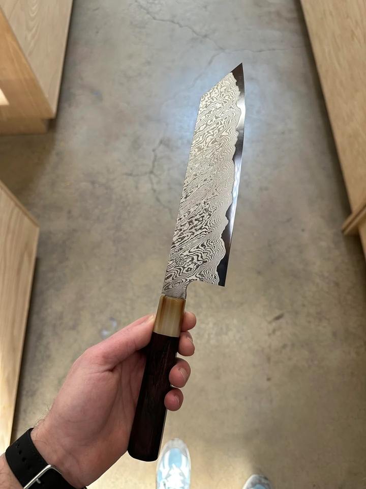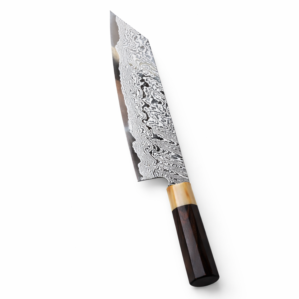 Cuchillo de Chef Hecho a Mano por Edge Master Manufacture, Hoja de Acero de Damasco Altamente Pulida de 8-9.9 Pulgadas, Mango de Madera Ambidiestro, Funda de Cuero