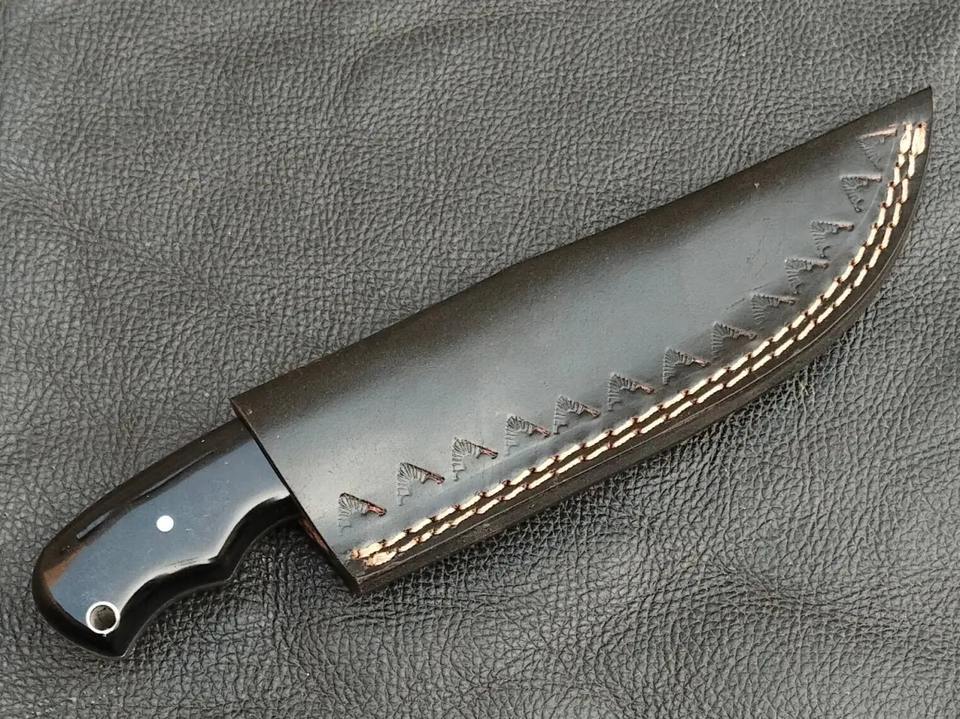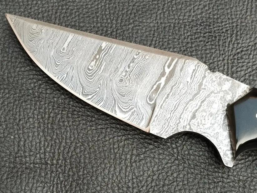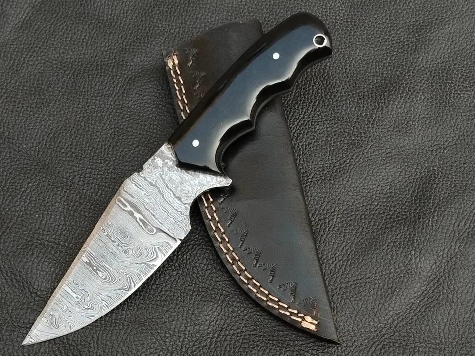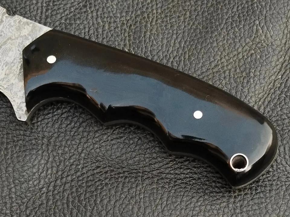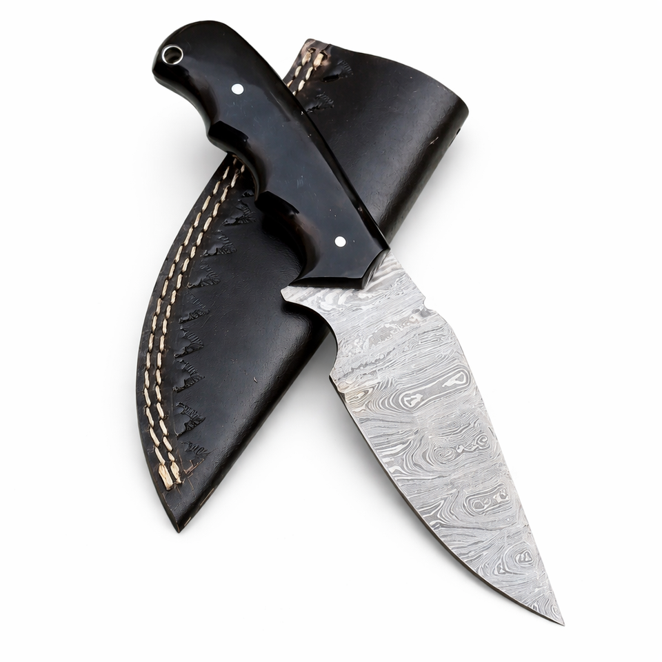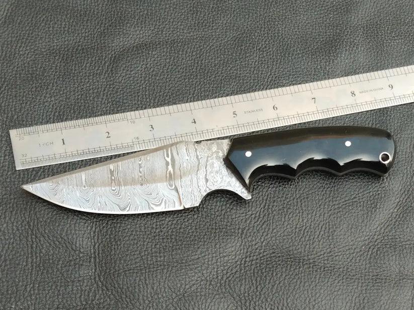 Cuchillo de caza Edge Master hecho a mano, de grado DIY, con hoja de acero de Damasco, mango de cuerno negro y funda de cuero (ODM)